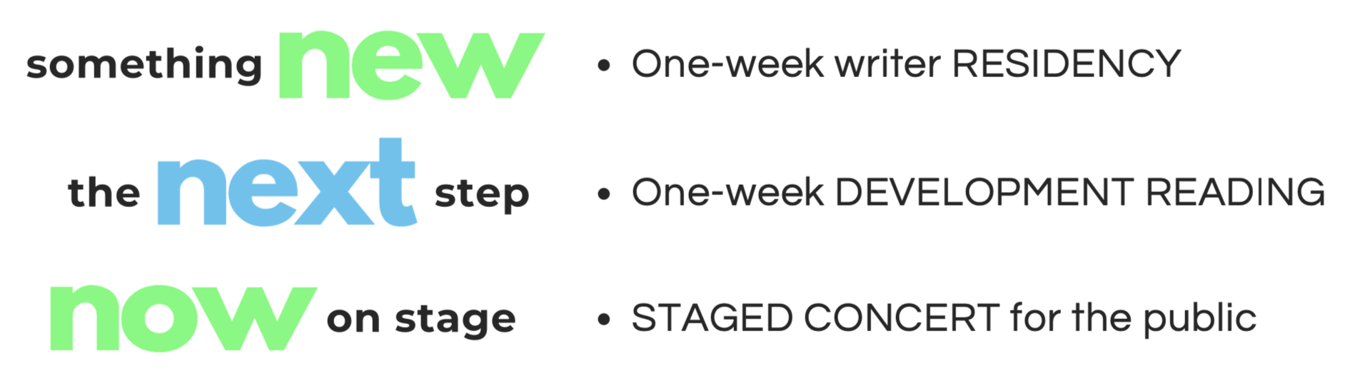 NEW, NEXT, NOW is a series of residencies, readings and high-quality, professional concert productions designed to support the development of new voices, new ideas, and new ways to create cross-generational conversations that celebrate, expand and diversify the musical theatre canon.